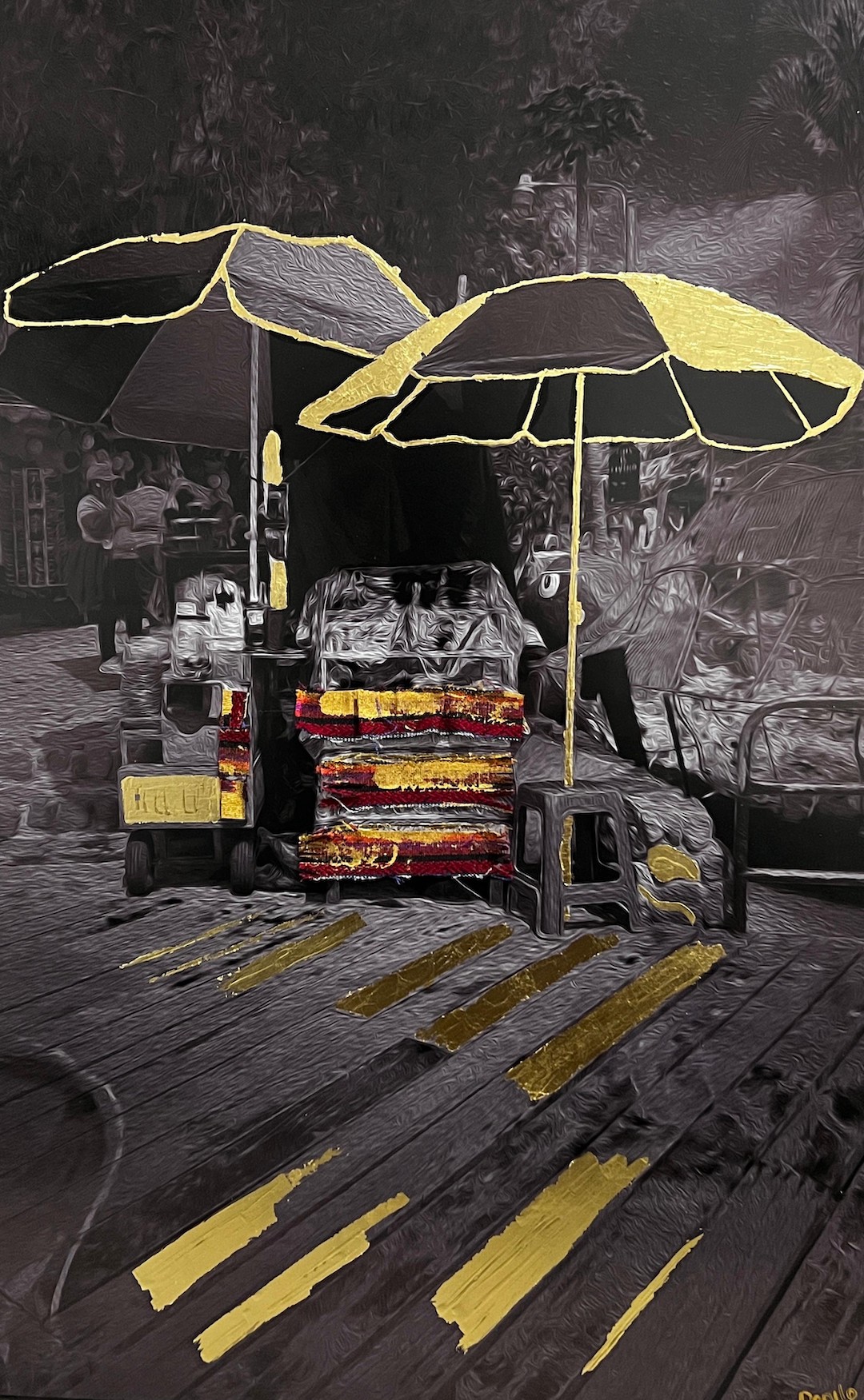 “Puesto de frutas”, 24″ X 36″, mixed medium, US$ 1,800.