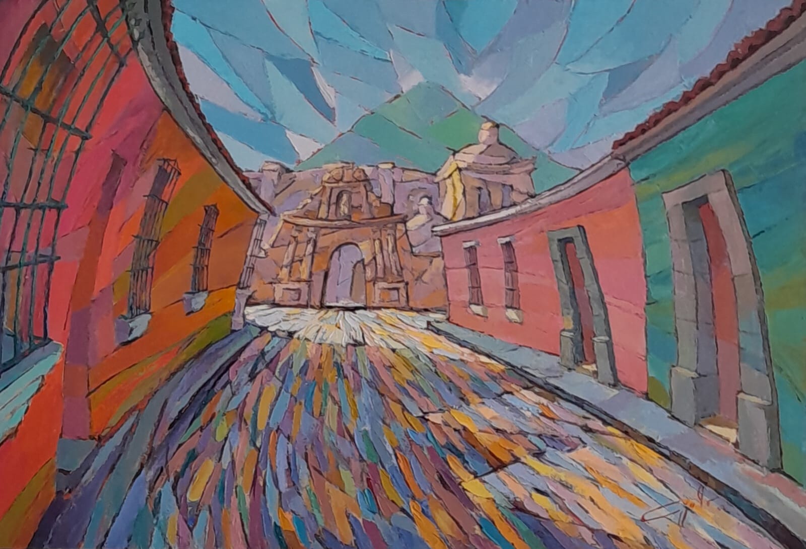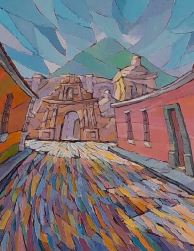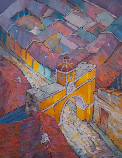Hugo González Ayala was born in 1954, in Guatemala City. This artist is in love with his country. His paintings are luminescent in their hues and mystical in essence. They capture the beauty of rural landscapes, patchworks of cultivated fields and of colorful village homes, and provide birds-eye views of towns that entice viewers to meander thrugh their cobbled paths. Streetscapes of the historic Antigua depict a town silenced by night but radianting under street lights.